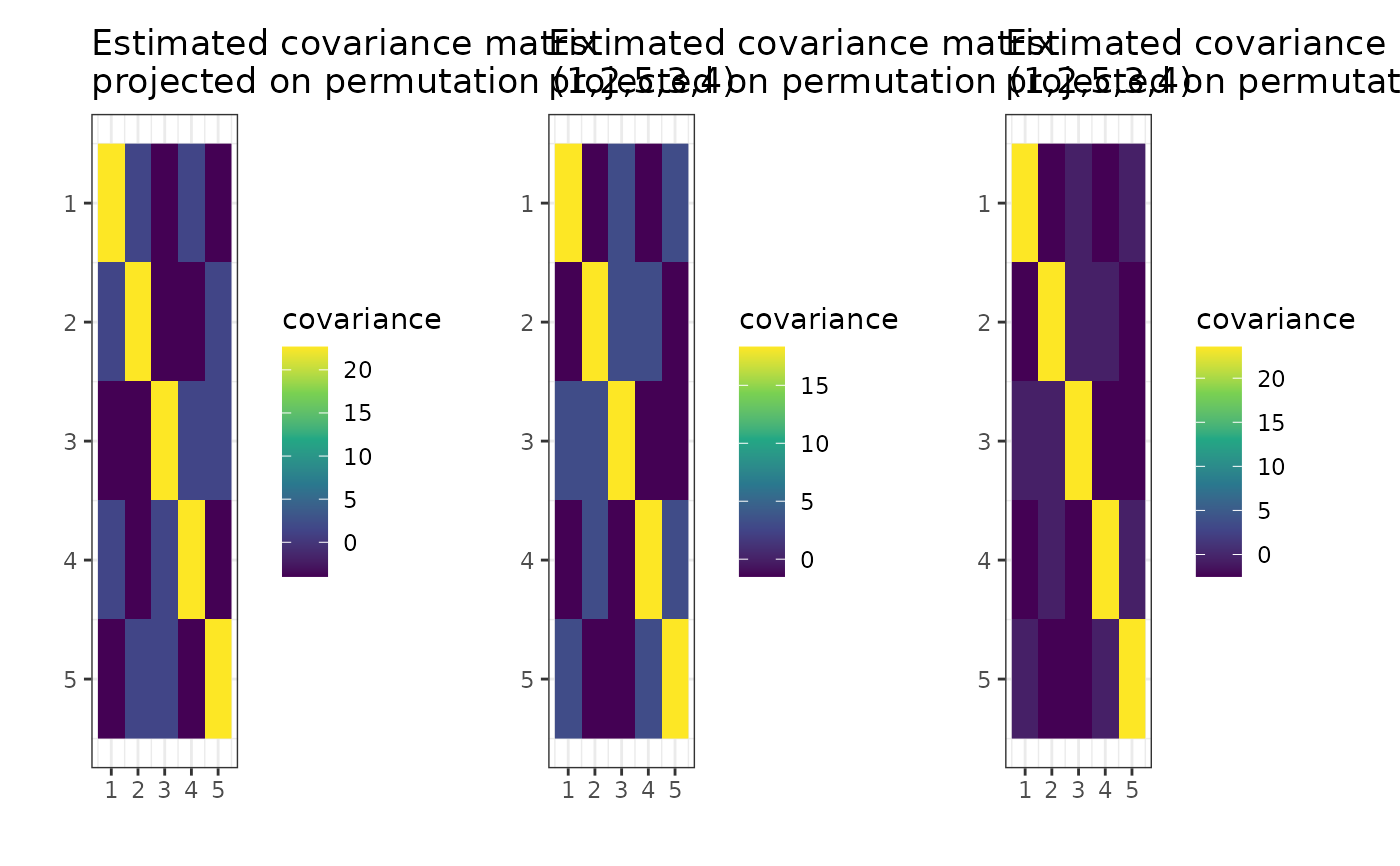 stats::cov()– TheSsparameter, as a list of empirical covariance matrices, is most of the time a result of thecov()function. For more information, see Wikipedia - Estimation of covariance matrices.find_MAP()– The function that finds the Maximum A Posteriori (MAP) Estimator for a givengipsmultobject.gips::gips_perm()– The constructor of agips_permclass. Thegips_permobject is used as the base object for thegipsmultobject.