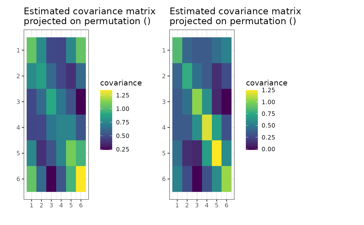 c("heatmap", "MLE", "best", "all", "both", "n0", "block_heatmap"):"heatmap","MLE"- Plots heatmaps of the Maximum Likelihood Estimator of the covariance matrices given the permutation. That is, theSsmatrices inside thegipsmultobject projected on the permutation in thegipsmultobject."best"- Plots the line of the biggest a posteriori found over time."all"- Plots the line of a posteriori for all visited states."both"- Plots both lines from "all" and "best"."n0"- Plots the line ofn0s that were spotted during optimization (only for "MH" optimization)."block_heatmap"- Plots heatmaps of diagonally block representation ofSs. Non-block entries (equal to 0) are white for better clarity.